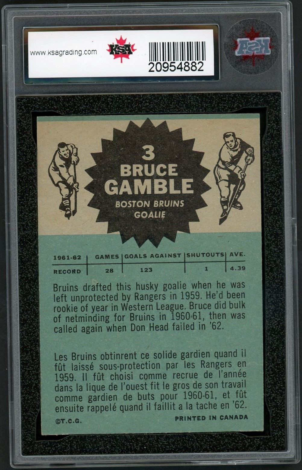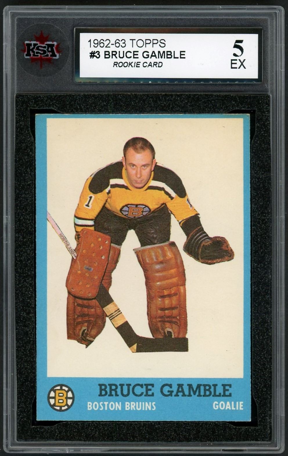 Nice rookie card of goalie Bruce Gamble, who had a solid career and was MVP of the 1968 All Star game. Graded 5 EX by KSA.