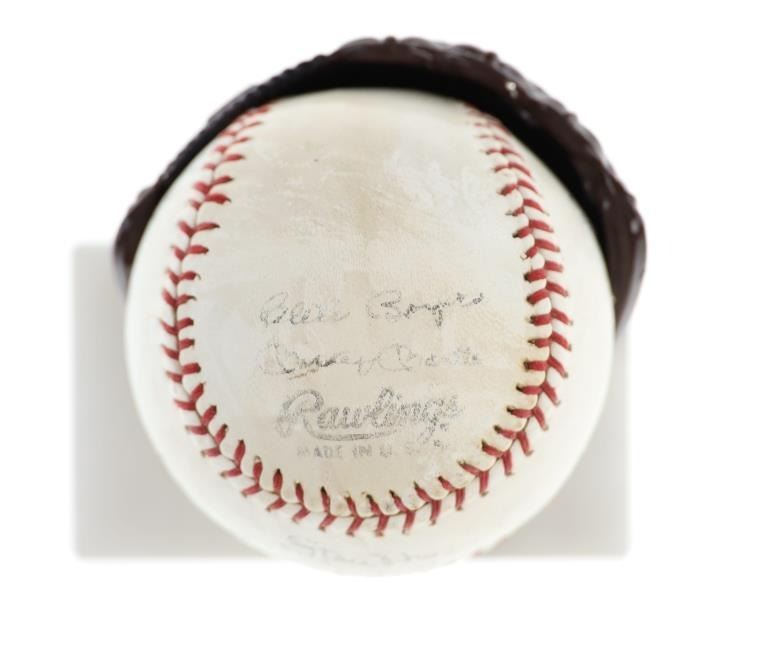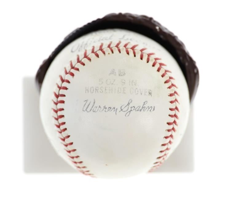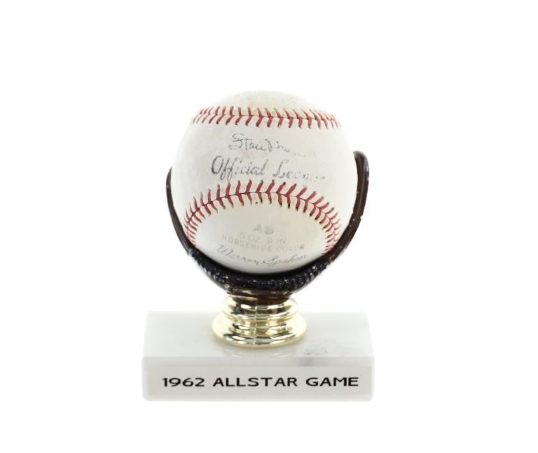 Featured in this lot is this signed baseball from the 1962 All-star baseball game with nine signatures. The baseball shows a solid construction that shows good seams and is in good preserved condition. The baseball shows nine signatures, but only four are legible. The legible signatures are as follows: Warren Spahns (Pitcher, Braves), Dick Groat (Short Stop, Pirates), Tommy Davis (Outfielder, Dodgers) and Stan Musial (Outfield, Cardinals). The ball comes from the 1962 Allstar game between the National League and the American League, with the players mentioned above playing on both teams. The National team won the game with 8 points against the American's 4 points. The baseball sits on a baseball glove stand and white rock base with the front reading, "1962 Allstar Game". The ball shows good condition with some signatures fading but still present. The stand shows good condition as well. The stand measures 3" L x 3 5/8" W x 3 1/4" H. The height of the stand with the ball measures 4 7/8". The ball and stand weigh 402.3 grams.