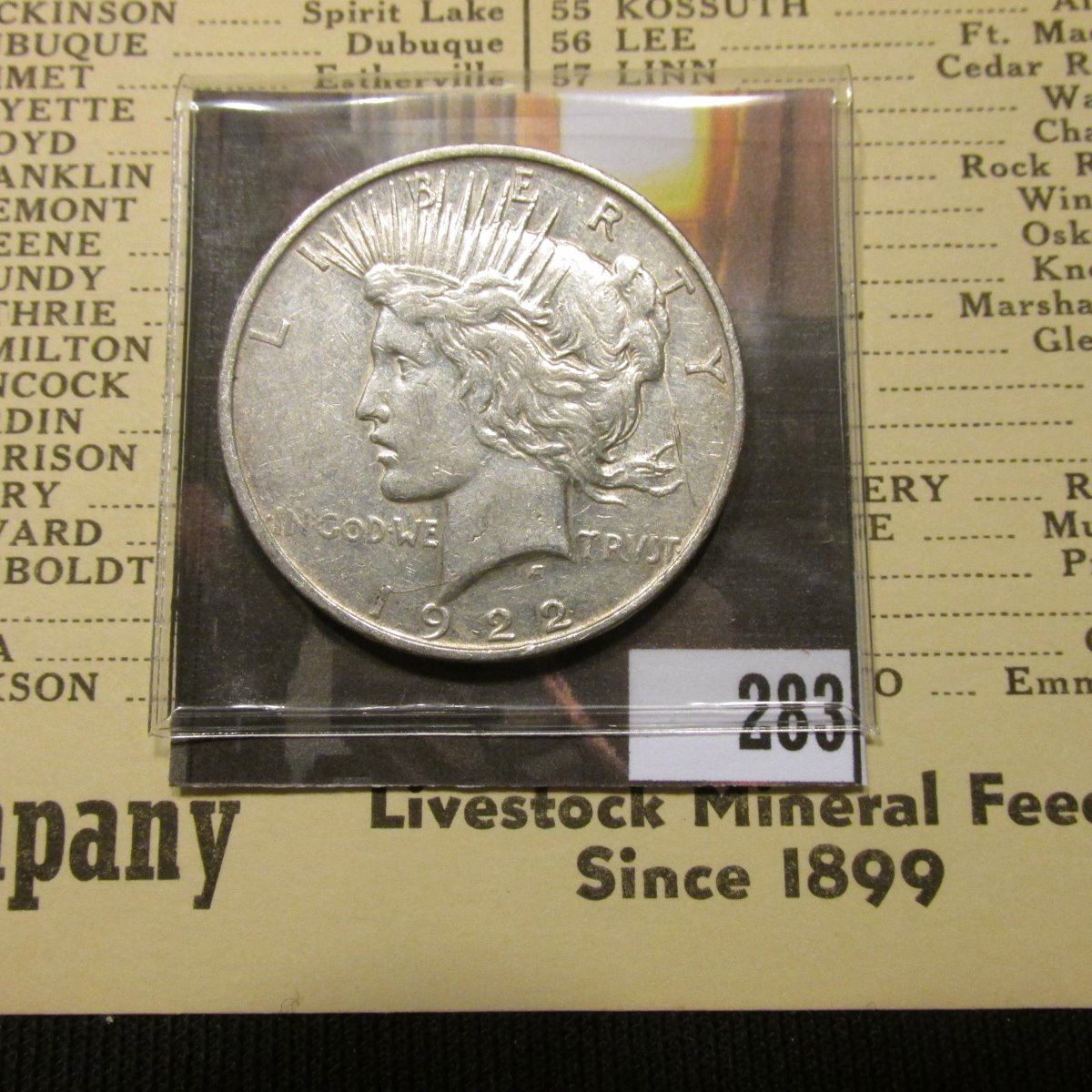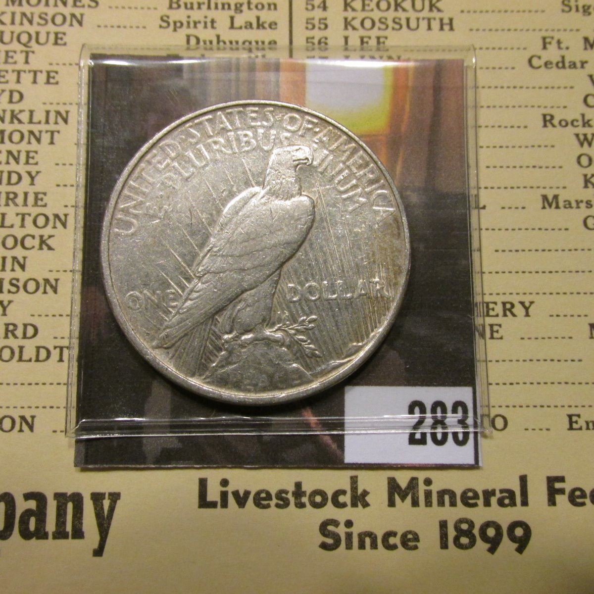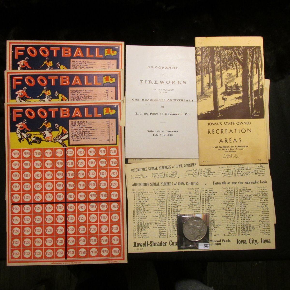 1962 Booklet "Iowa's State Owned Recreation Areas State Conservation Commission..."; "Football" Acme Novelty & Mfg. Co., Chicago (Punch Card Bingo); (7) Cards "Automobile Serial Numbers of Iowa Counties…Howell-Shrader Company…Iowa City, Iowa" cards; "July 4th, 1902 Wilmington, Delaware "Programme of Fireworks on the Occasion of the One Hundredth Anniversary of E.I. Du Pont De Nemours & Co."; & 1922 D U.S. Peace Silver Dollat, VF.