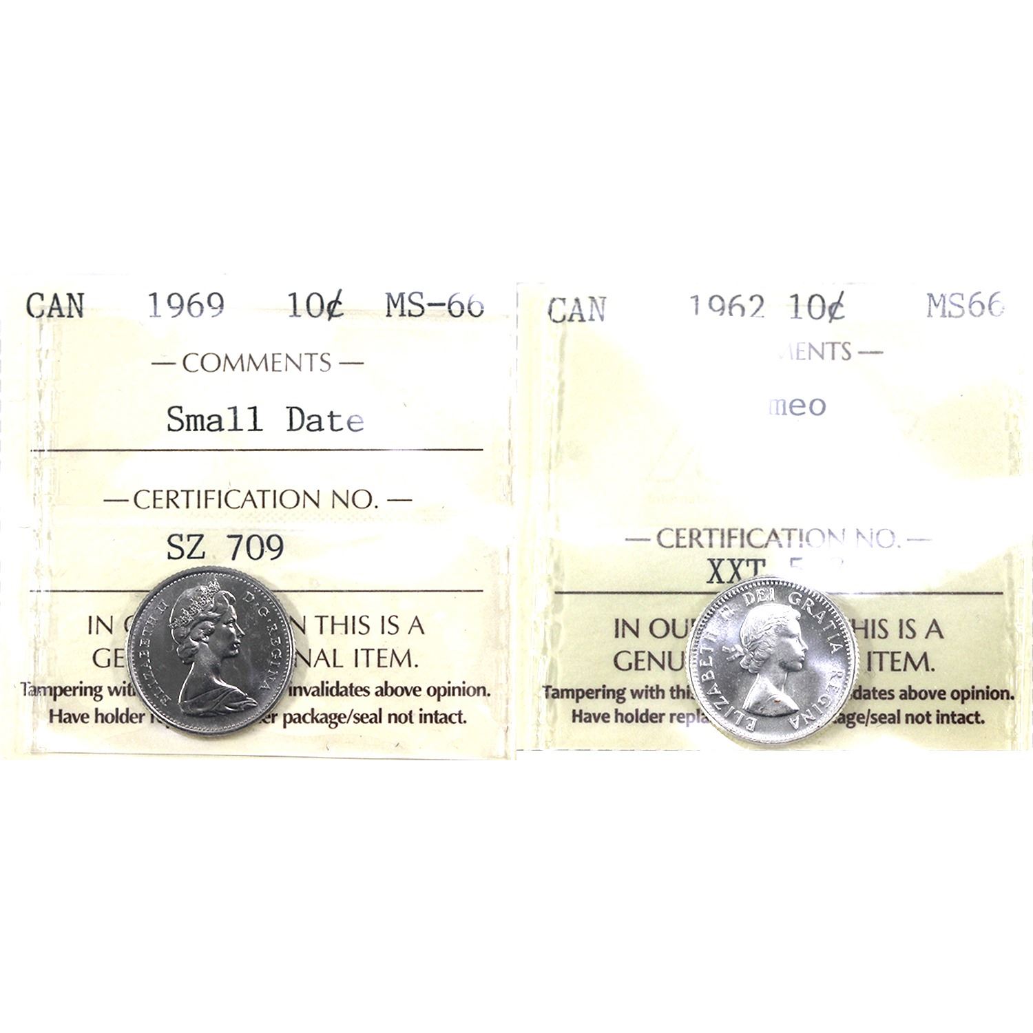 1962 Cameo & 1969 Small Date Canada 10-cent ICCS MS66. 2pcs
