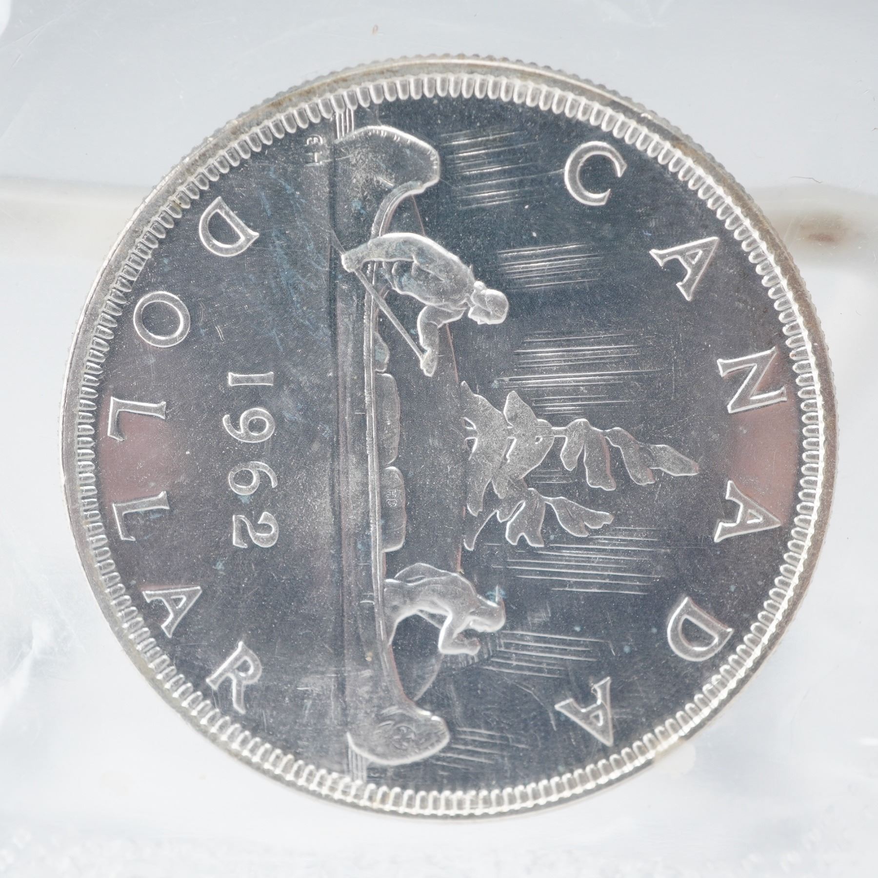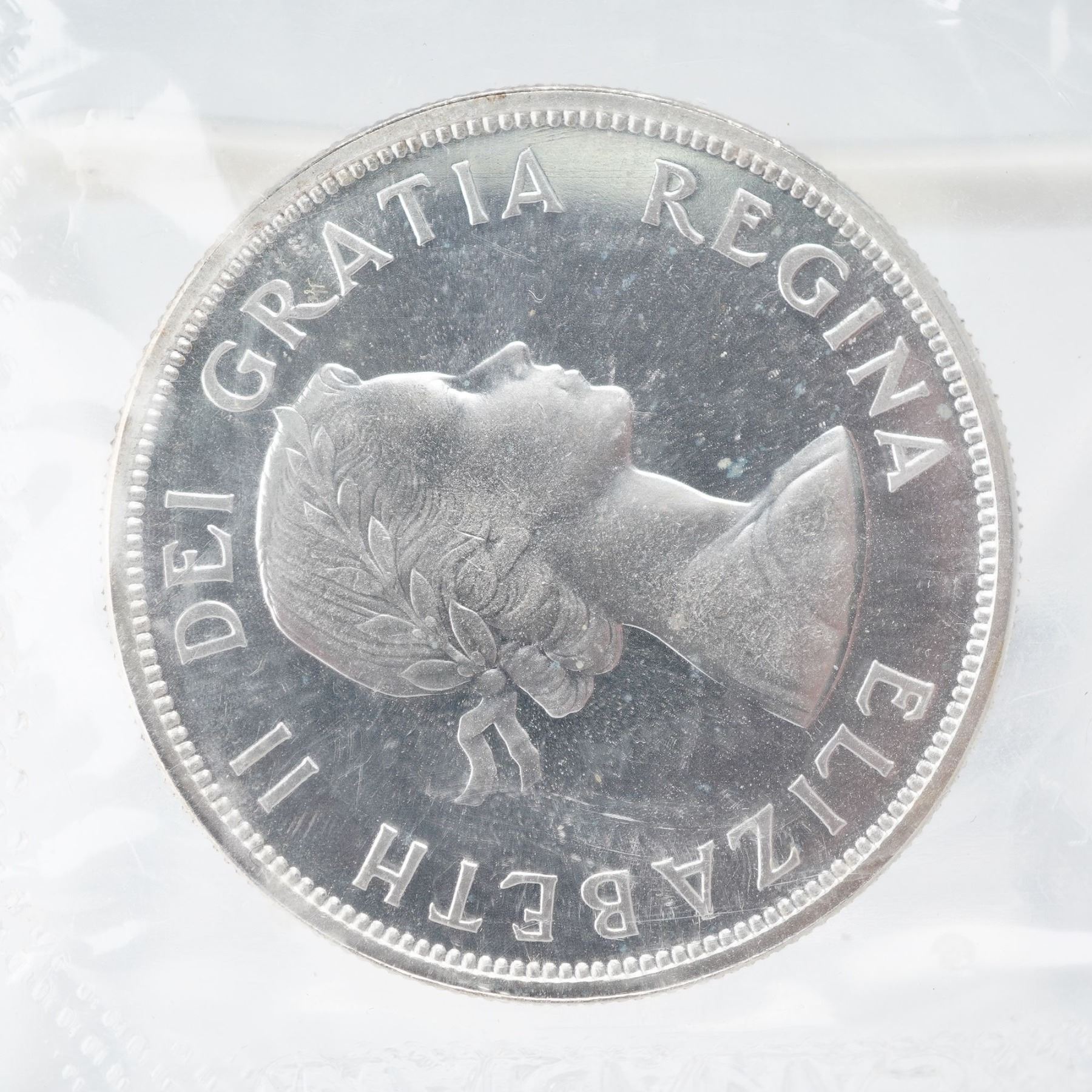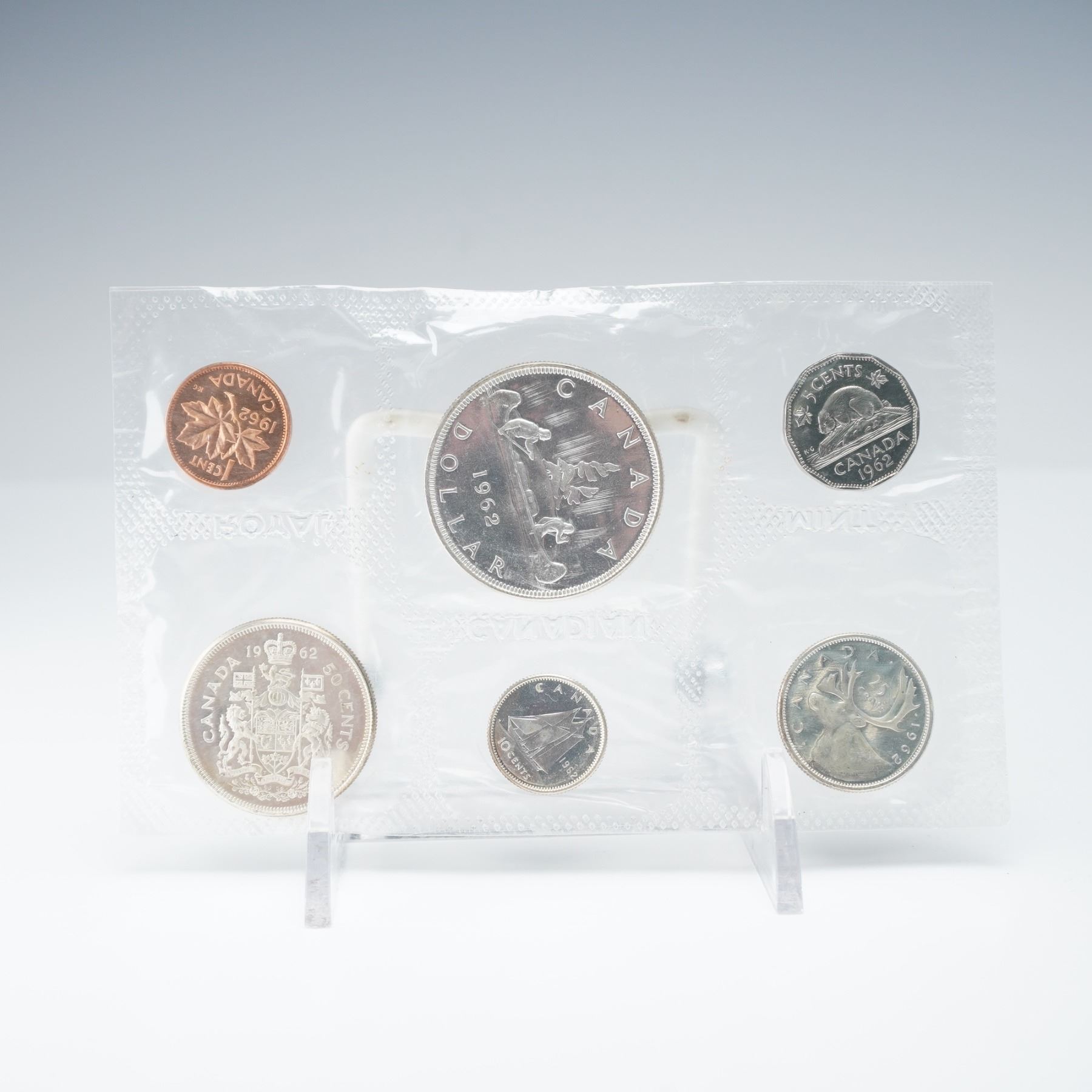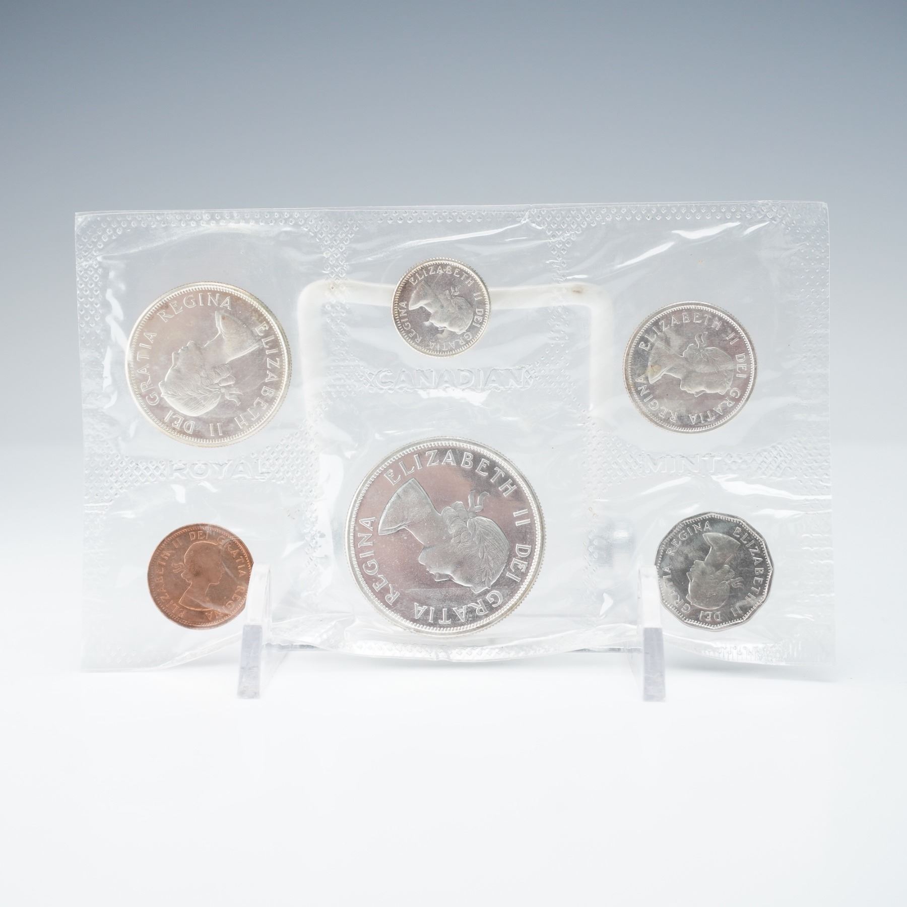 Sealed in its original government-issued cello packaging, the set includes the silver dollar featuring the iconic Voyageur design, alongside the half dollar, quarter, dime, nickel, and cent-all bearing the young laureate portrait of Queen Elizabeth II with the inscription Elizabeth II Dei Gratia Regina. The reverse designs include classic Canadian motifs such as the Voyageur canoe scene, the caribou, the Bluenose schooner, the beaver, and the maple leaf.