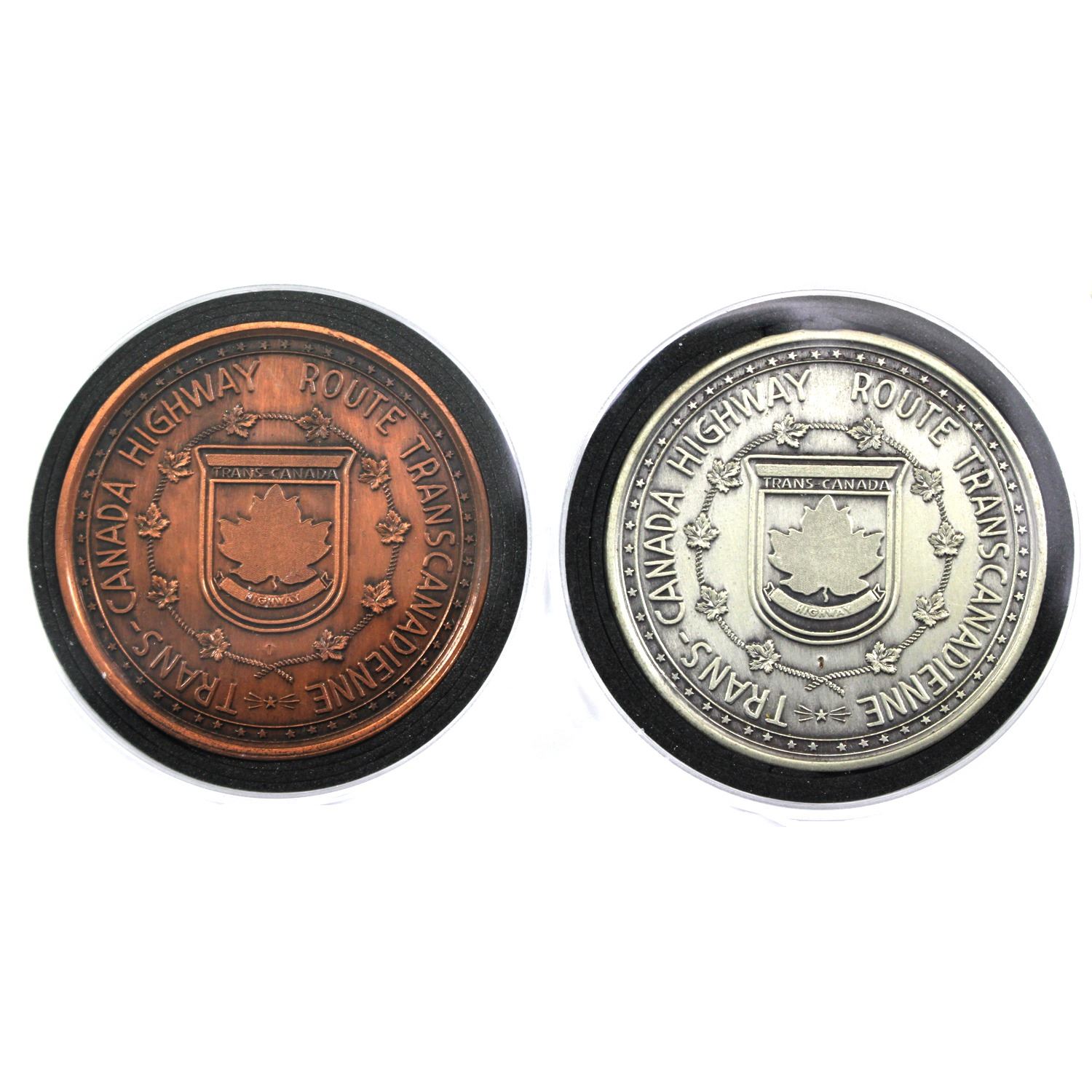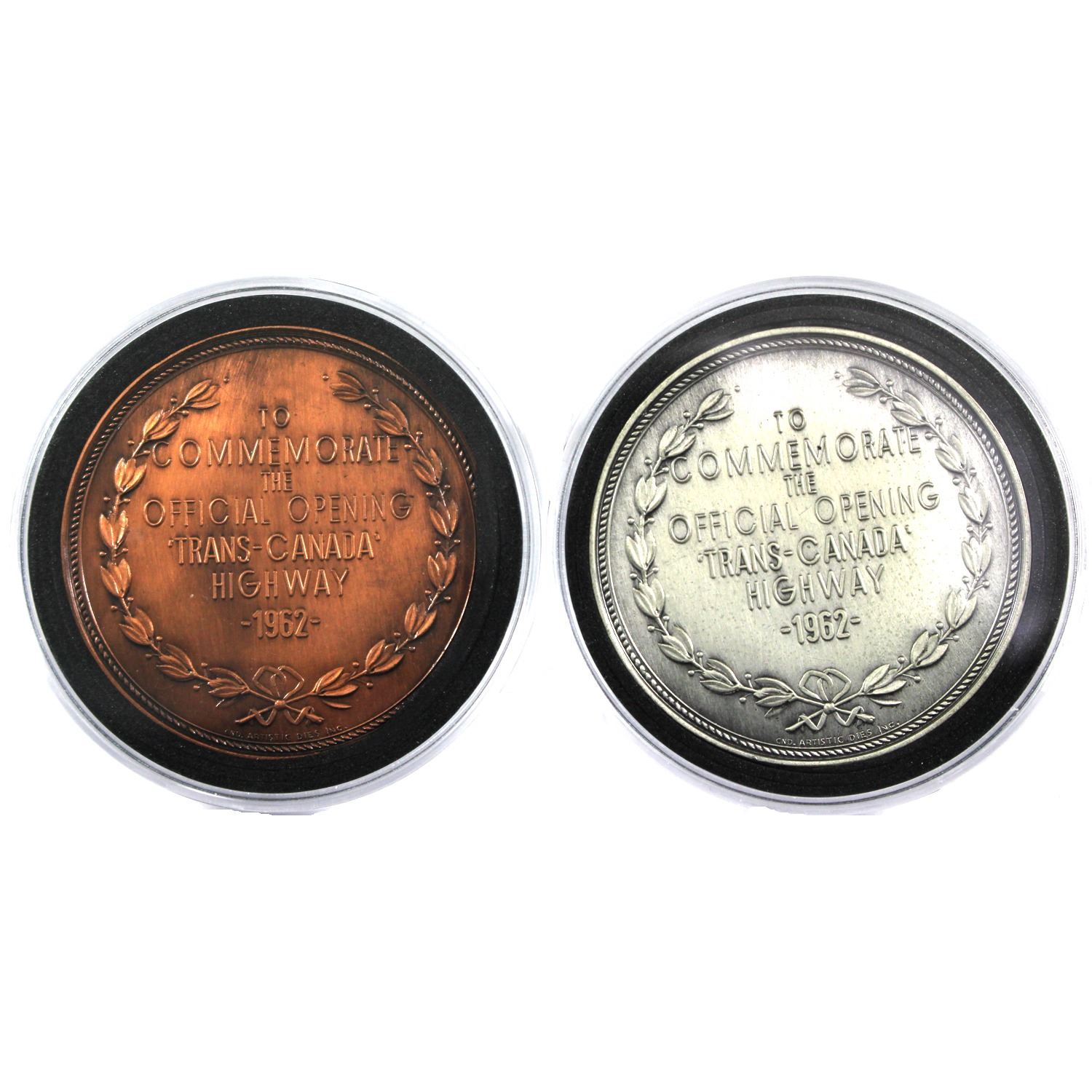 1962 Canada trans-Canada highway medals. Lot of 2pcs; one silver Specimen with a weight of 76.12 grams and one bronze specimen weighing 63.5 grams. C commemorative medal set issued that year for the opening of the highway. Mintage unknown and medals come without a presentation case or COA.