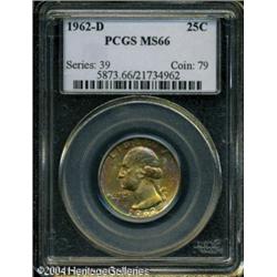 1962-D 25C MS66 PCGS. Lush ruby-red, sea-green, an <B>1962-D 25C MS66 PCGS.</B></I> Lush ruby-red, sea-green, and honey-gold colors bathe this lustrous and suitably struck premium Gem. An impressive piece worthy of a competitive Registry Set. <BR><BR><B>Important notice:</B> Heritage usually auctions material at the rate of 200-250 lots per hour. On some occasions eBay Live bid software or the Internet may not be able to keep up with the pace of the auction. We recommend placing a realistic absentee bid now as insurance to avoid disappointment. Occasionally the auctioneer may eliminate or reject an eBay Live bid, and the auctioneer may also reopen a lot after the close of the eBay live bidding (usually because we missed an audience bid), and may reject your bid even if it shows you as the winning bidder. By bidding via eBay Live, you agree that Heritage may award the lot to another bidder at its sole discretion under the circumstances described above or any other reasonable circumstances. Since eBay bids are not shown to us until we open the lot on the floor, we treat those bids just like floor bids. In most cases the floor responds before the eBay bid is presented to us, due to Internet lag time, so for consistency we have made it a policy that floor bids are always considered first over tie eBay live bids. Also please note that all Heritage lots purchased through eBay Live carry a 20% Buyer's Premium. Please make sure you read the Terms and Conditions before you bid. This lot is being auctioned in conjunction with a live floor auction by Heritage Galleries & Auctioneers. All final auction and invoice information will be supplied by Heritage Galleries & Auctioneers, and all other information should be considered preliminary. Lot:6007