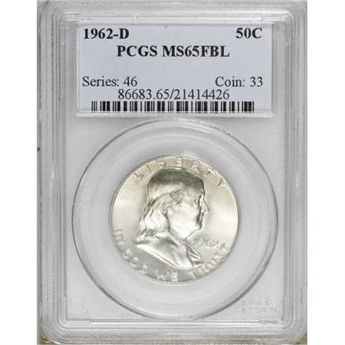 <B>1962-D 50C MS65 Full Bell Lines PCGS.</B></I> PCGS Population (245/10). NGC Census: (73/1). Numismedia Wsl. Price for NGC/PCGS coin in MS65: $525. (#86683)<BR><BR><b>Shipping:</b> Coins & Currency (<a target="_blank" href="http://www.heritageauctions.com/common/shipping.php">view shipping information</a>)