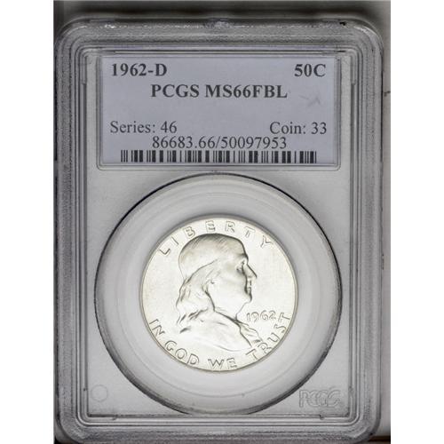 <B>1962-D<50C> MS66 Full Bell Lines PCGS.</B></I> A brilliant and lustrous Gem with frosty, silver surfaces. This example diverges from the typically seen specimen and features exceptionally clean surfaces with any significant bagmarks or toning spots. Sharply struck and with exceptional eye appeal. Population: 10 in 66, 0 finer (3/06).<BR><I>From The Alex & Nan Registry Sets.</B></I> <BR><BR><B>Important notice:</B> Heritage usually auctions material at the rate of 200-250 lots per hour. On some occasions eBay Live bid software or the Internet may not be able to keep up with the pace of the auction. We recommend placing a realistic absentee bid now as insurance to avoid disappointment. Occasionally the auctioneer may eliminate or reject an eBay Live bid, and the auctioneer may also reopen a lot after the close of the eBay live bidding (usually because we missed an audience bid), and may reject your bid even if it shows you as the winning bidder. By bidding via eBay Live, you agree that Heritage may award the lot to another bidder at its sole discretion under the circumstances described above or any other reasonable circumstances. Since eBay bids are not shown to us until we open the lot on the floor, we treat those bids just like floor bids. In most cases the floor responds before the eBay bid is presented to us, due to Internet lag time, so for consistency we have made it a policy that floor bids are always considered first over tie eBay live bids. Also please note that all Heritage lots purchased through eBay Live carry a 20% Buyer's Premium. Please make sure you read the Terms and Conditions before you bid. This lot is being auctioned in conjunction with a live floor auction by Heritage Galleries & Auctioneers. All final auction and invoice information will be supplied by Heritage Galleries & Auctioneers, and all other information should be considered preliminary. Lot:3135 <BR><BR><B>Winning Notification and Billing:</B> After the FINAL session in this auction is complete, Heritage will send e-mail and snail mail invoices. This process normally takes several days. All final auction and invoice information will be supplied by Heritage Galleries & Auctioneers, and all other information should be considered preliminary. <BR><BR>This auction will be conducted on a live auction floor and over the Internet through eBay Live. If you choose to place an absentee bid, please take a moment to <font color='#0000ff'><u><a href='http://pages.ebay.com/liveauctions/help/before/laabsentee.html'>learn how eBay Live absentee bidding works</a></u></font><font color='#000000'>