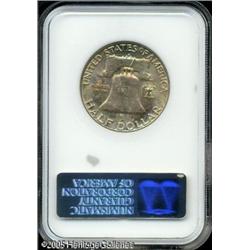<B>1962-D 50C MS66 NGC.</B></I> A mix of rose, sky-blue, lime-green, beige, and champagne colors bathe lustrous surfaces, showing slightly deeper hues on the reverse. Adequately impressed on the motifs, that illustrate just a few minute marks consistent with the grade. Population: 6 in 66, 0 finer (1/05).<BR><I>From The Stevenson Collection.</B></I> Lot:8328