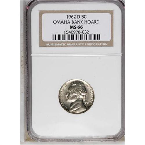 <B>1962-D 5C MS66 NGC.</B></I> Ex: Omaha Bank Hoard. NGC Census: (28/0). PCGS Population (0/0). Mintage: 280,195,712. Numismedia Wsl. Price for NGC/PCGS coin in MS66: $48. (#4072)<BR><BR><b>Shipping:</b> Coins & Currency (<a target="_blank" href="http://www.heritageauctions.com/common/shipping.php">view shipping information</a>)
