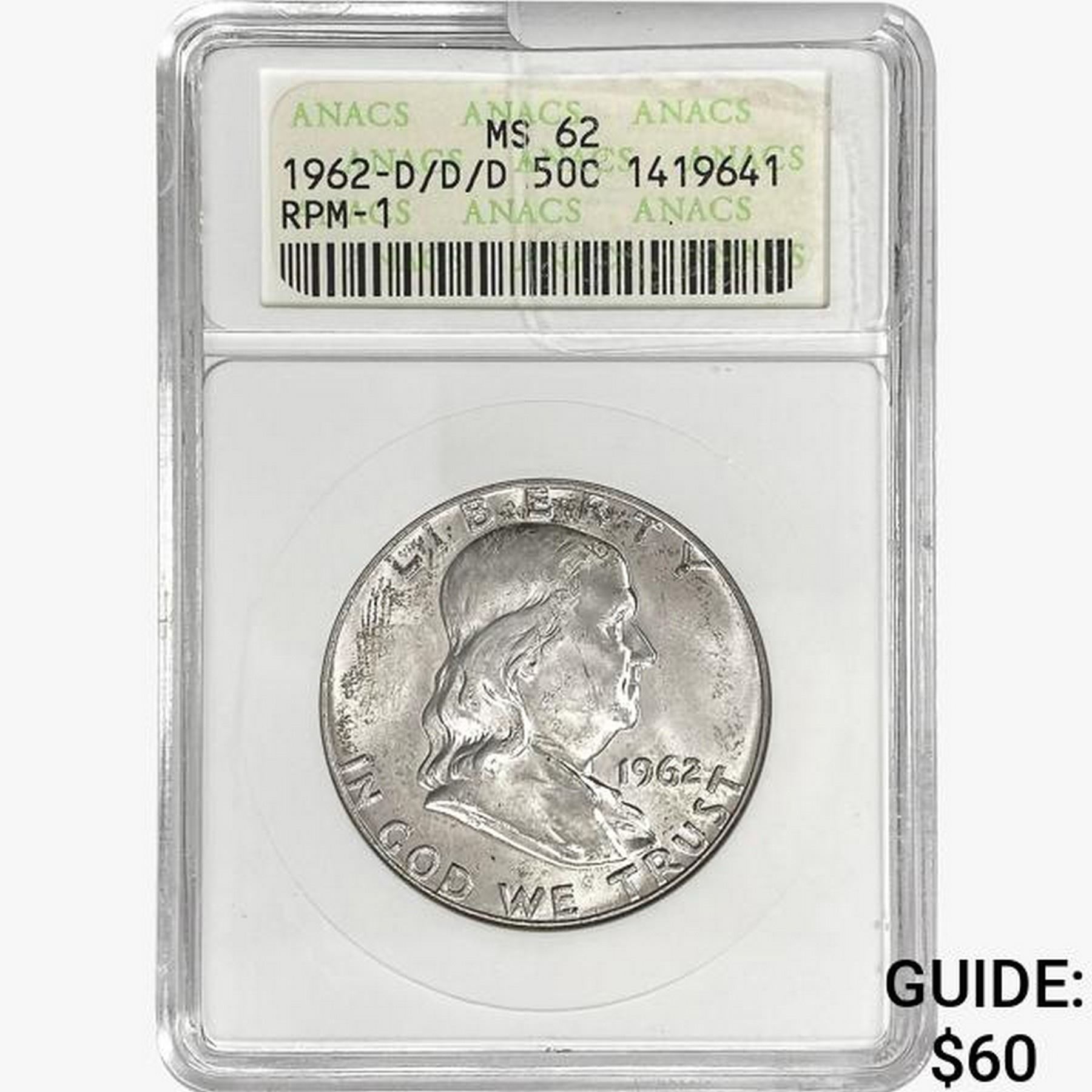 1962-D/D/D Franklin Half Dollar ANACS MS62 RPM-1