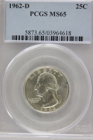 This wonderful coin is a 1962 D Washington Quarter. This coin has been graded MS 65 by PCGS. This nearly perfect coin is made of 90% silver and would make a fantastic addition to any collection.