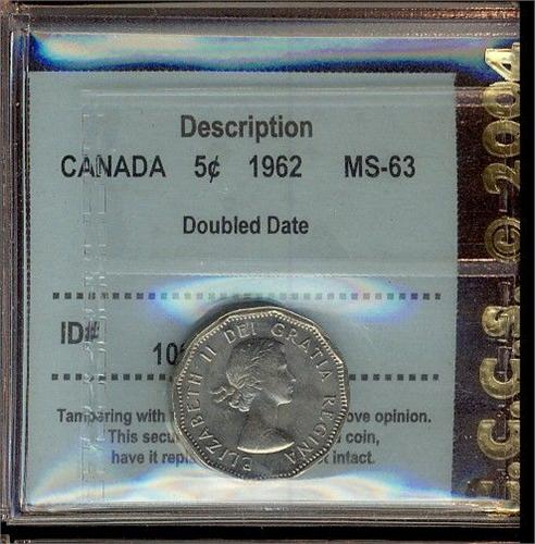 1962 Doubled date 5¢ CCCS MS63. Believed to be scarce. This is the real doubled date not just the re-engraved.