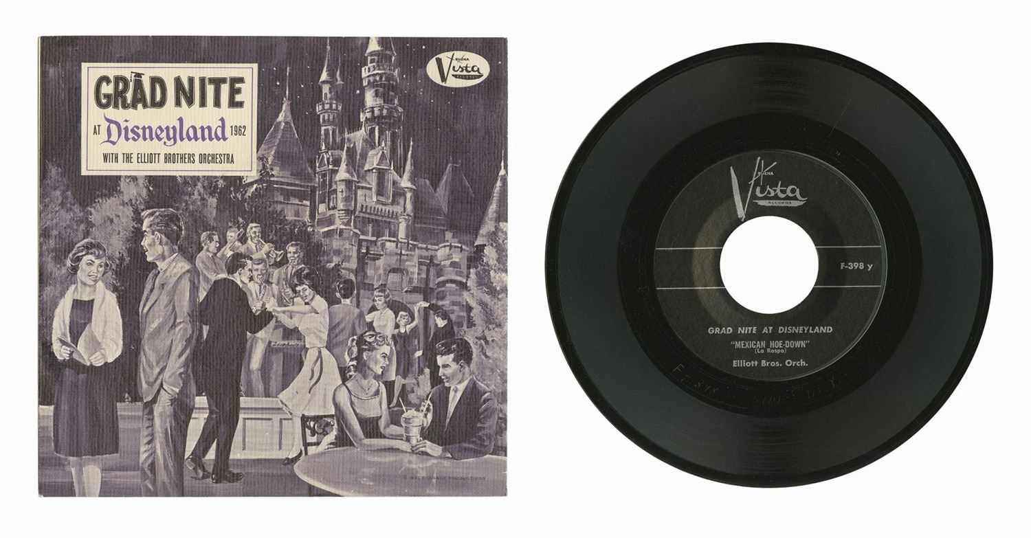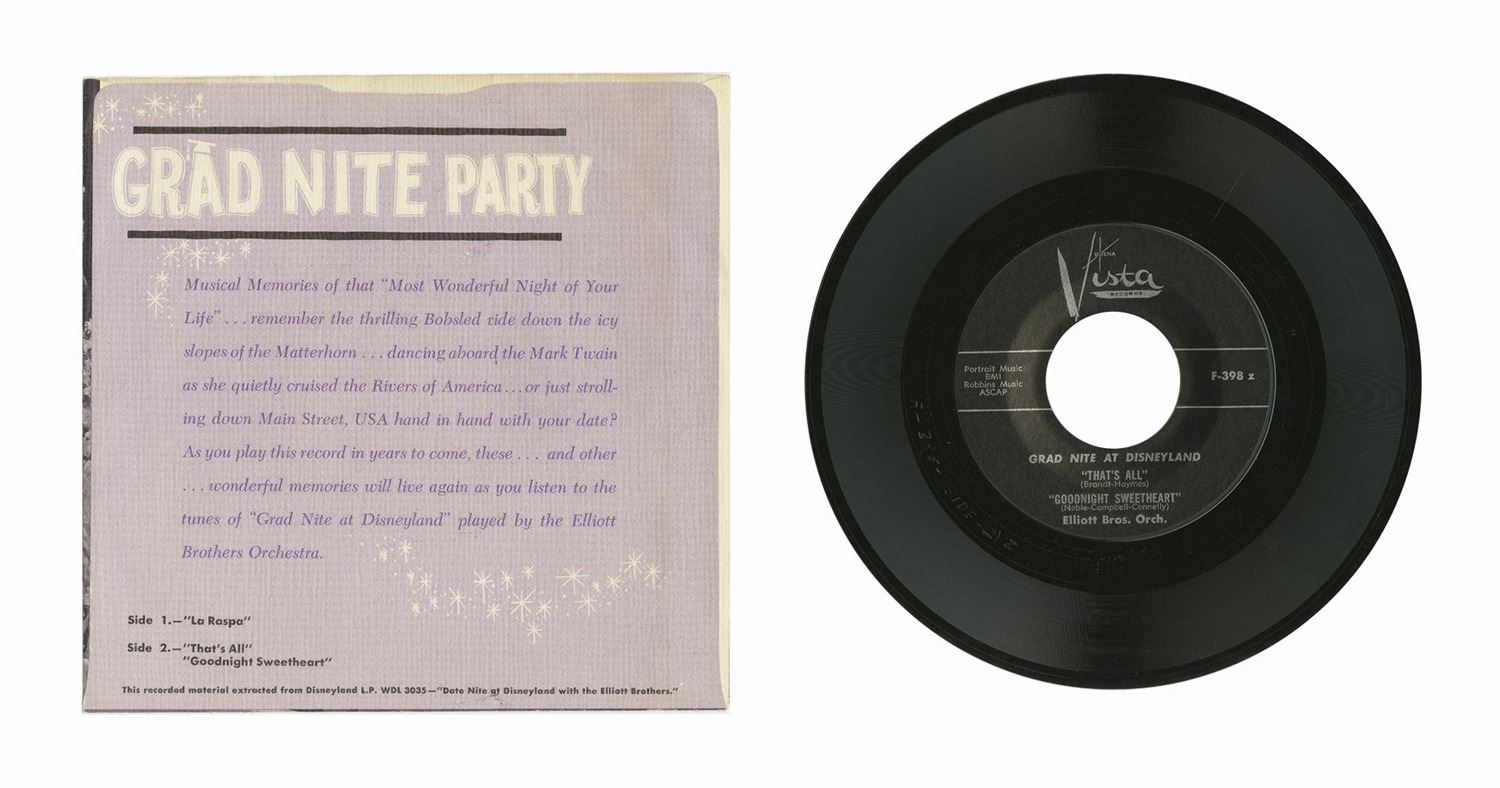 (Disneyland, 1962) A 45rpm "Grad Nite at Disneyland" record featuring music performed by the Elliott Brothers Orchestra. The cover depicts a charming musical performance in front of Sleeping Beauty Castle. Measuring 7"x7.25" within the paper sleeve, the record is in very good condition with minor wear.