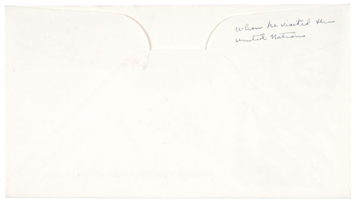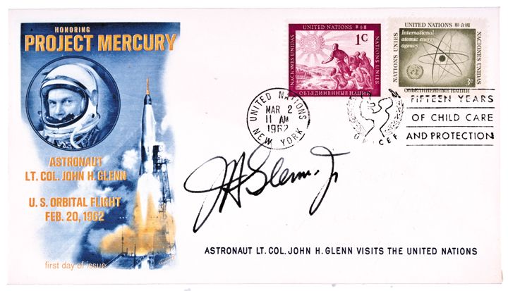 March 2, 1962-Dated, Autograph upon Project Mercury Cachet Postal Cover; signed at his United Nations visit, Choice Near Mint. His bold Hand-Signed Autograph, “J H Glenn, Jr” written in vivid deep black ink upon a fresh, colorful vignette cover. Cover with Project Mercury FDC cachet -- signed 10 day after that flight when Glenn visited the United Nations. As fresh and exciting in appearance as it was 51 years ago!