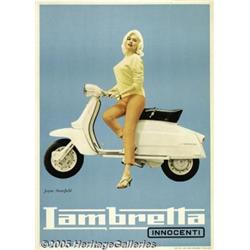<B>Lambretta (Rizzoli Grafica, 1962)</B></I> Advertising Poster (20" X 27"). Jayne Mansfield posing with Lambretta in 1962. A pair of icons combined on one poster to sell the famed Italian vehicle. This is one of the more famous Jayne Mansfield images and actually appeared on other posters with the Lambretta airbrushed out. This actual poster image was used as dust jacket art for LAMBRETTA: AN ILLUSTRATED HISTORY by Nigel Cox, 2002. Very Fine- condition.