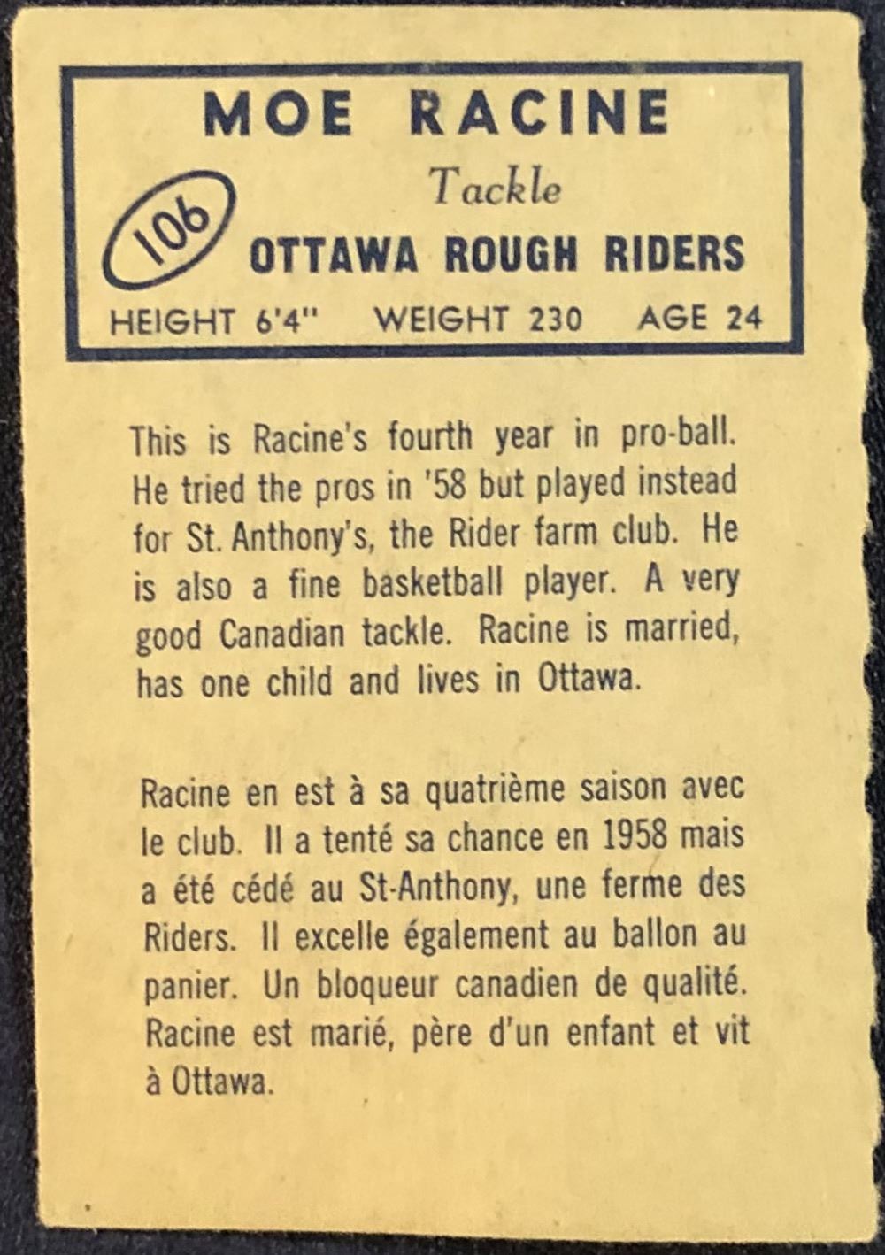 Card #106 CFL, football, vintage, OPC, hall of fame