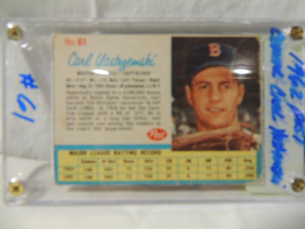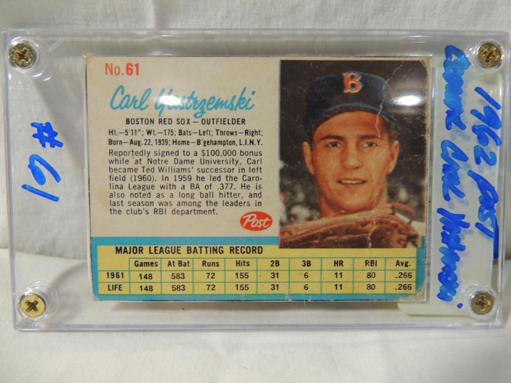 1962 POST CARL YASTRZEMSKI NO. 61 BASEBALL CARD. COLLECTIBLE. VINTAGE CARD. GOOD CONDITION. SCREW DOWN CASE. TRADING CARD. AS SHOWN. SEE PHOTO FOR MORE DETAILS.