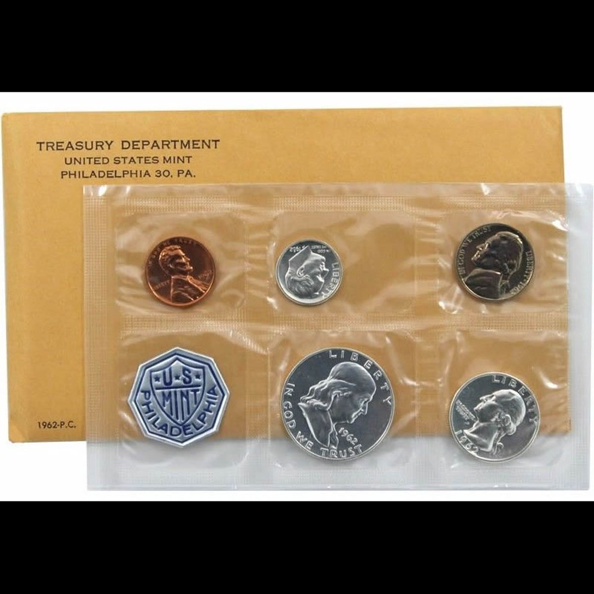 1962 Philadelphia United States Mint set in Original Government Packaging.. 1962 Philadelphia United States Mint set in Original Government Packaging. Set includes 1 Penny, 1 Dime, 1 Nickel, 1 Quarter, and 1 Half. Original packaging: Pliofilm packaging, similar to Proof Sets. The five coins from the Philadelphia Mint were placed in individual compartments in one pliofilm pack.