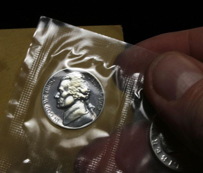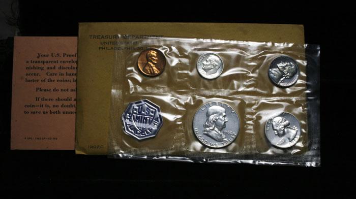 The set, has a 90% Silver Franklin Half, a 90% Proof Silver Quarter, a 90% Silver Dime, 2 Other Proof Coins including the cool blue toned Nickel, all in the Original Packaging including The Mint "Memo". Estimated Value $40