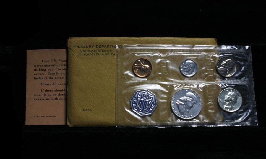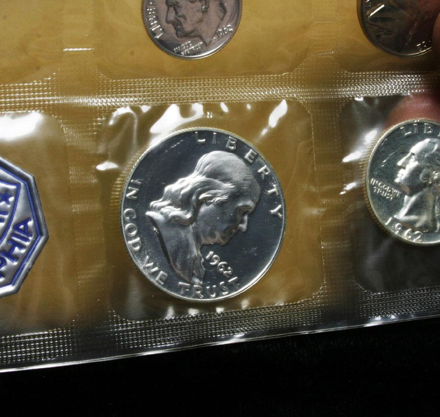 This Set has a Deep Cameo Franklin Half Dollar, Look at the pictures yourself. It is usually hard to tell in the Cellophane, but the frosted devices and deep mirrors on this half are striking even through the cellophane. PCGS lists a regular PR66 1962 Franklin Half at $38 and a PR66 DCAM at $130. Also the set, has a 90% Proof Silver Quarter, a 90% Silver Dime, 2 Other Proof Coins and as mentioned the 90% Silver Deep Cameo Franklin Half Dollar, all in the Original Packaging including The Mint "Memo". Estimated Value $100