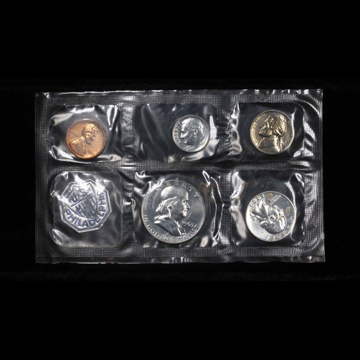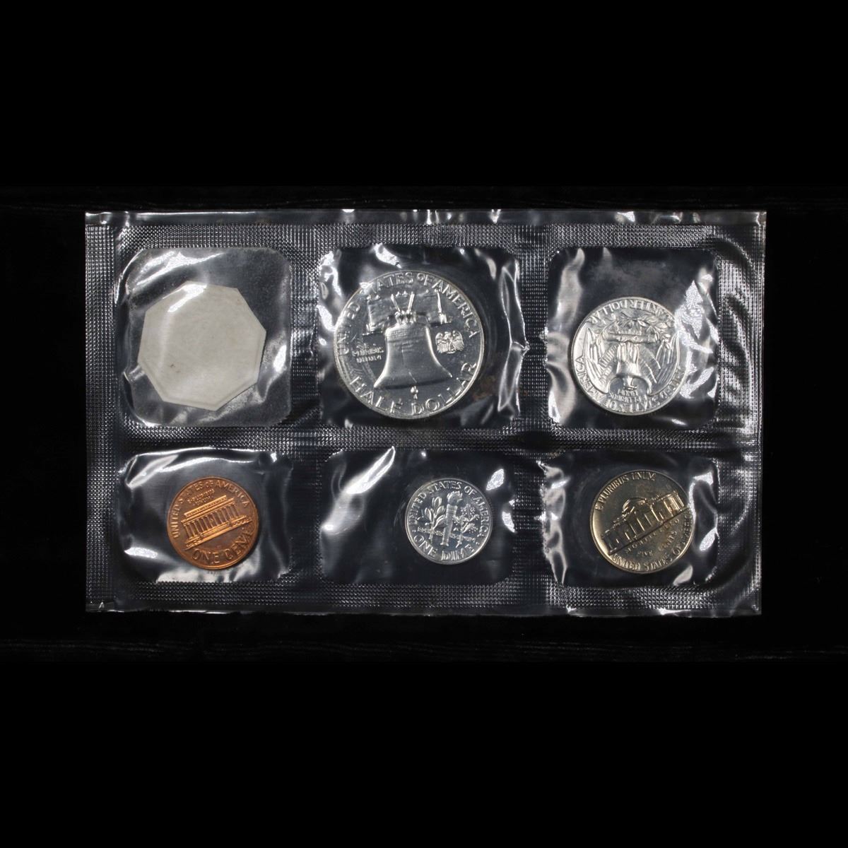 1962 Proof Set in Original mint packaging . This set, has a 90% Proof Silver Franklin Half Dollar, a 90% Proof Silver Quarter, a 90% Proof Silver Dime, plus the proof nickel and proof penny.