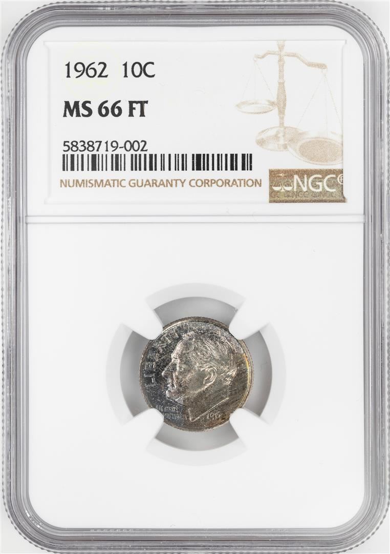 One 1962 Roosevelt Dime Coin NGC MS66FT Nice Toning. NGC Certified.