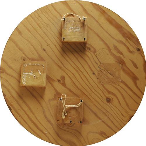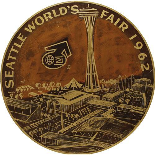 <B>1962 Seattle World's Fair Sign.</B></I> If a Kennedy-era American wanted a preview of the 21st century, the Seattle World's Fair was the place to be. Wonders of a high tech age to come were displayed with a curious mix of scientific fact and fiction to an eager public. This large, 23.75", hand-painted disc evokes the fair's spirit of optimistic wonderment in a memorable early 1960s style. A bird's-eye view of the grounds is carefully rendered in gold paint on a brown background with "SEATTLE WORLD'S FAIR 1962" forming the perimeter. Most conspicuous, of course, is the tapering "Space Needle" that symbolized the fair and its futuristic theme. In excellent condition as made. <BR><BR><B>Important notice:</