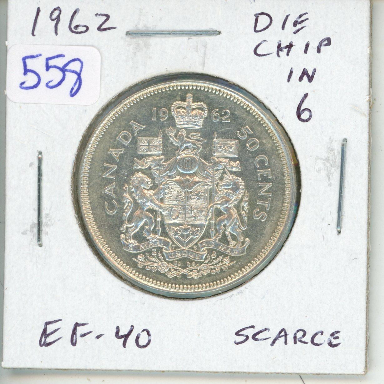 1962 Silver 50 Cents with Die Chip in 6. EF-40. Scarce.
