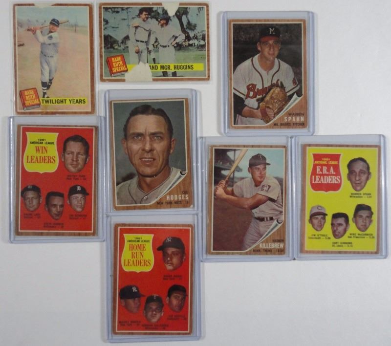 INCLUDES: #53 HR LDRS MANTLE / MARIS VG, #56 LDRS SPAHN EX+, #57 LDRS FORD VGEX, #70 KILLEBREW VG, #85 HODGES VG, #100 SPAHN VGEX, #137 & #141 RUTH Fair Tape. ESTIMATE 80.00-100.00