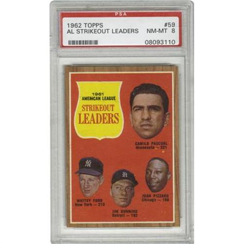 <B>1962 Topps AL Strikeout Leaders #59 PSA NM-MT 8.</B></I> High-grade card from the 1962 Topps issue features the previous season's strikeout leaders in the AL. The PSA 8 card features Whitey Ford, Camilo Pascual, and Jim Bunning.<BR><BR><b>Shipping:</b> Requires 3rd Party Shipping (<a target="_blank" href="http://www.heritageauctions.com/common/shipping.php">view shipping information</a>)