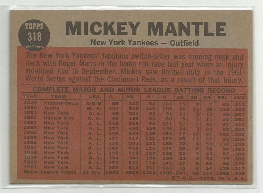 This "action" card of Mickey Mantle from the 1962 Topps Set is in Very Good to Excellent Condition.