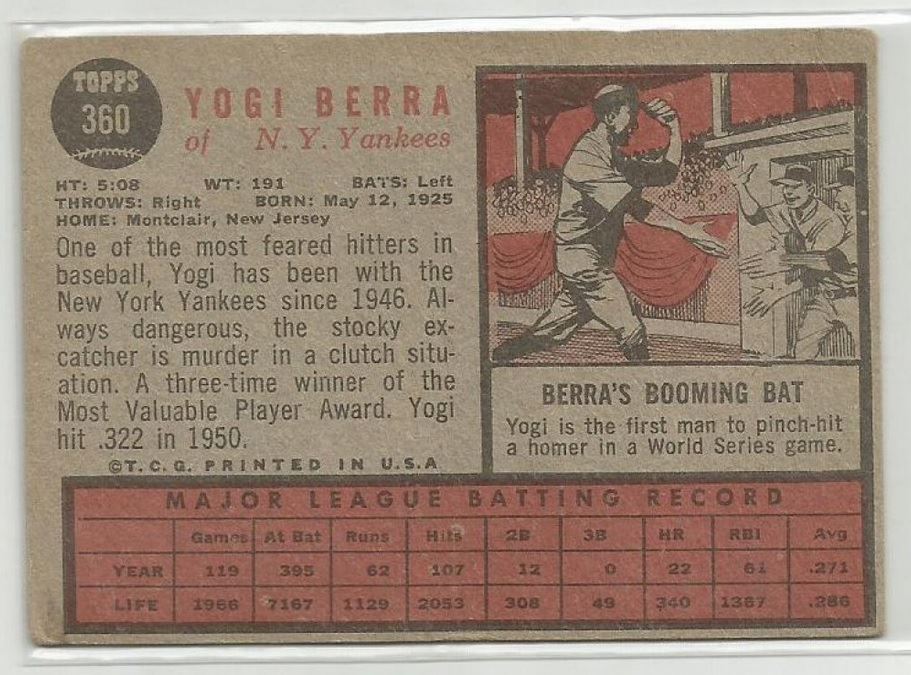 This Vintage 1962 Topps Yogi Berra Card is in Good Condition with a vertical crease.