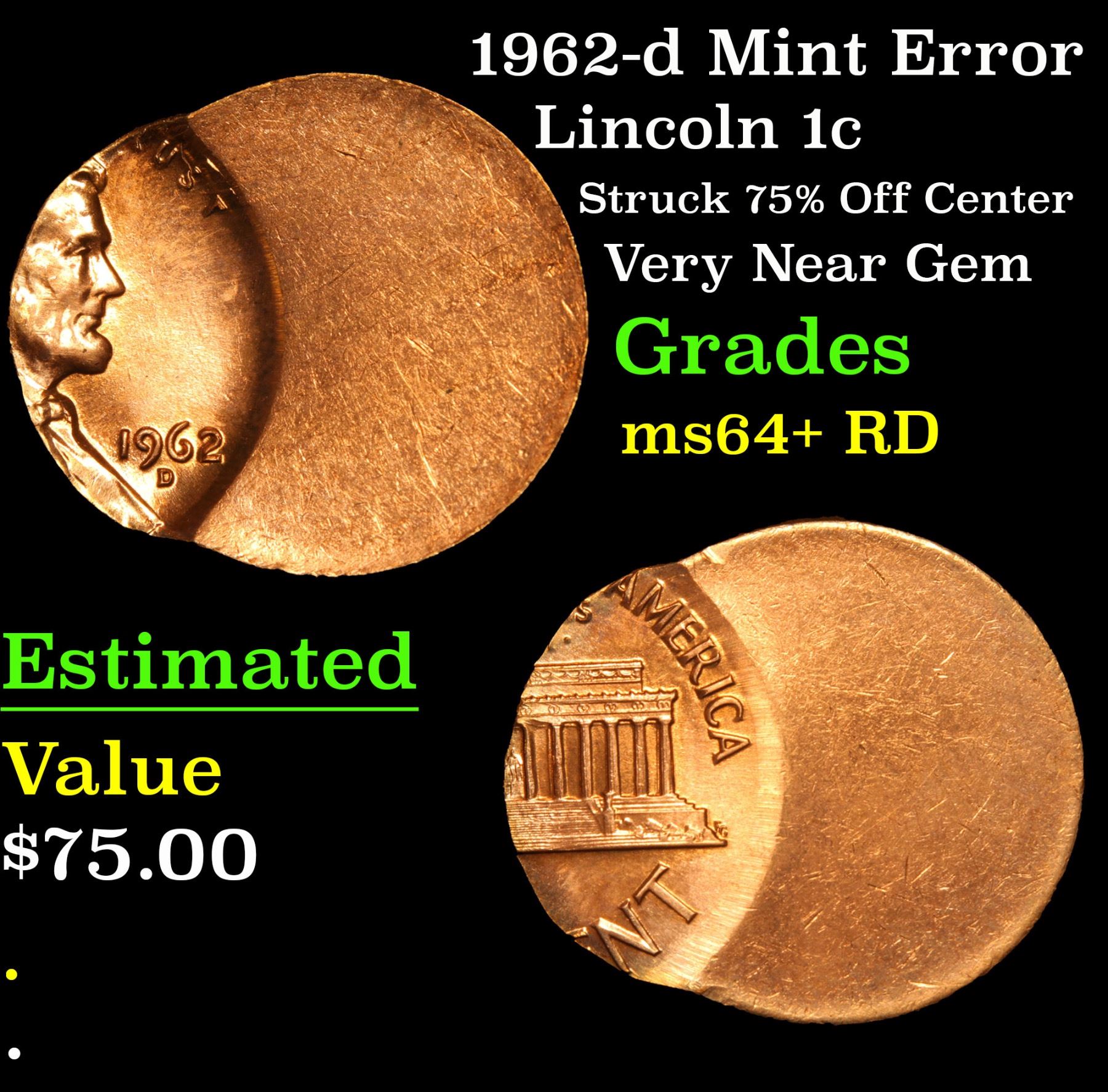 1962-d Mint Error Lincoln Cent 1c Grades Choice+ Unc RD. Struck 75% Off Center Very Near Gem A Corey's Pick
