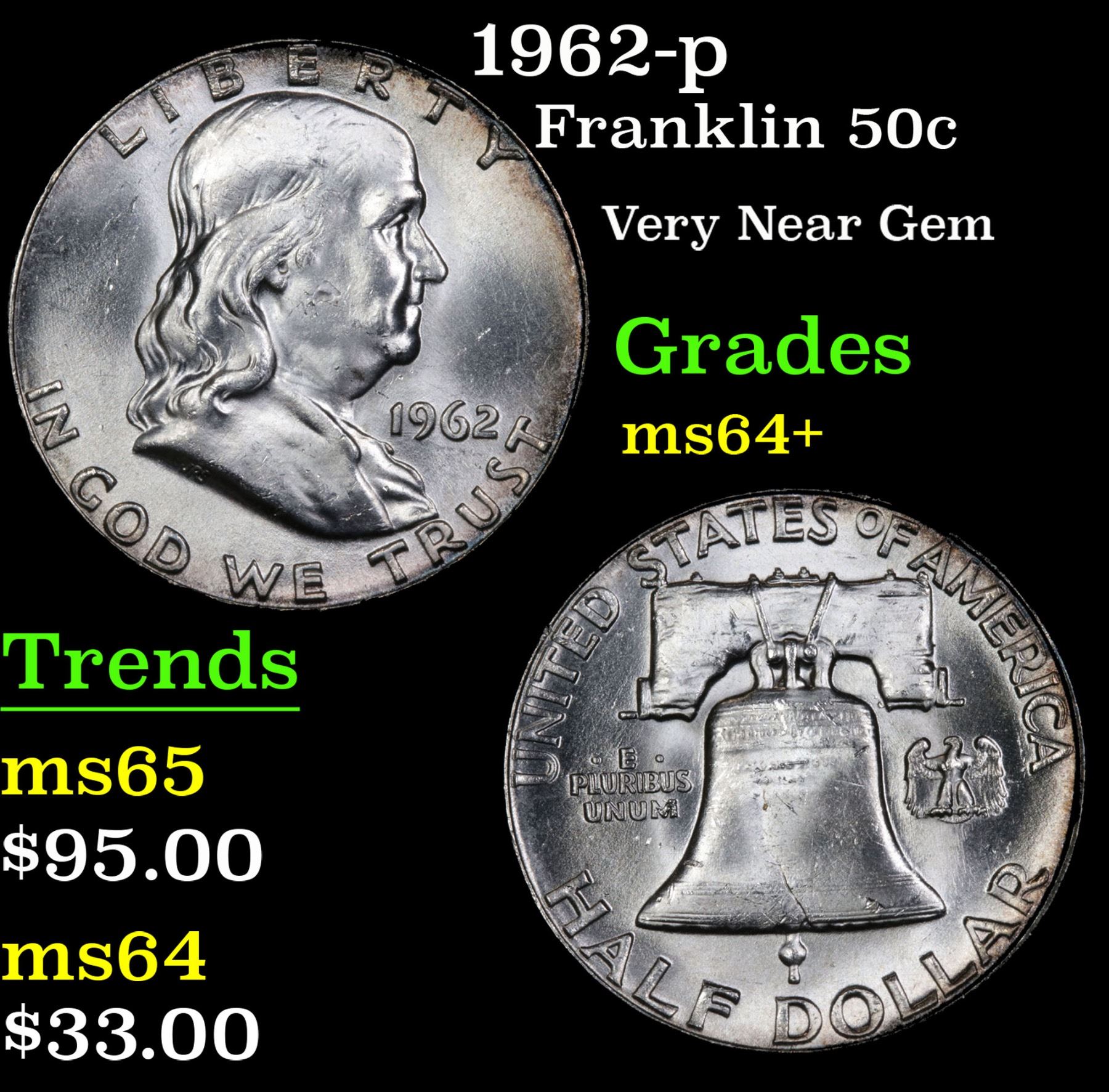 1962-p . Very Near Gem Franklin Half Dollar 50c Grades Choice+ Unc.