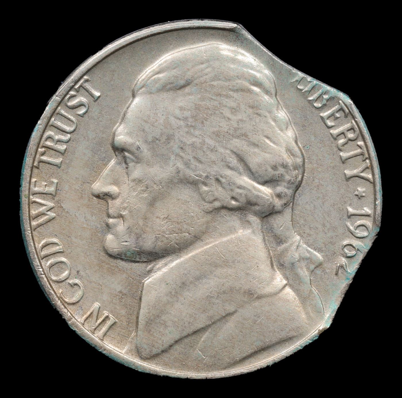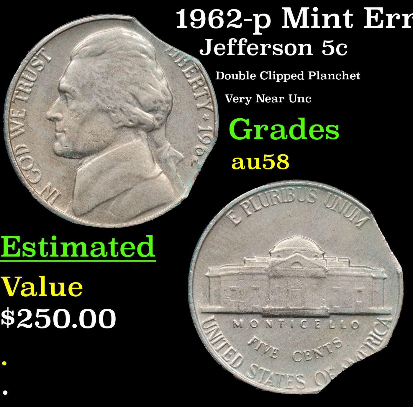 1962-p Mint Error Jefferson Nickel 5c Grades Choice AU/BU Slider.