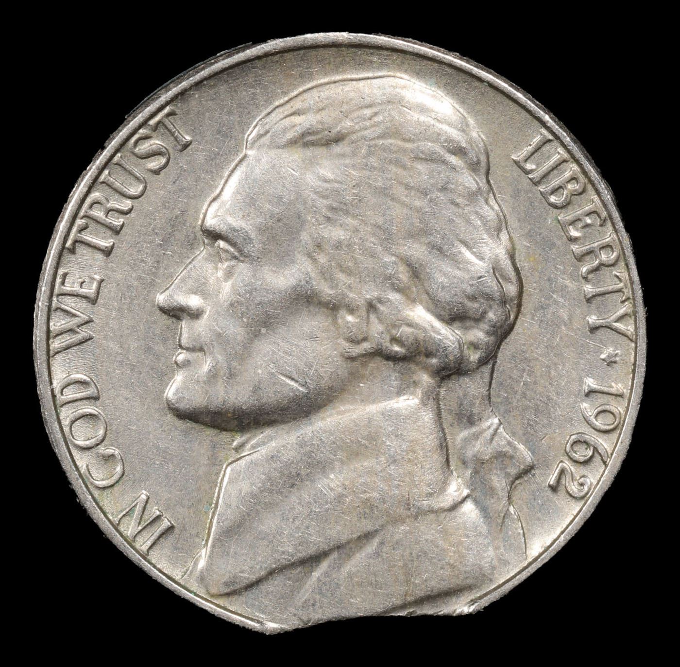1962-p Mint Error Jefferson Nickel 5c Grades Choice AU/BU Slider.