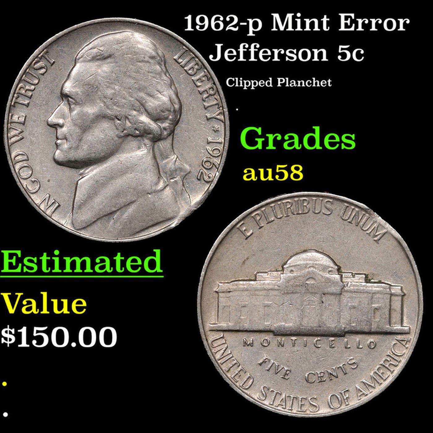 1962-p Mint Error Jefferson Nickel 5c Grades Choice AU/BU Slider.