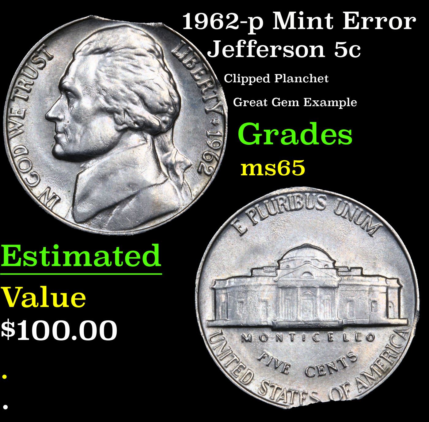 1962-p Mint Error Jefferson Nickel 5c Grades GEM Unc.