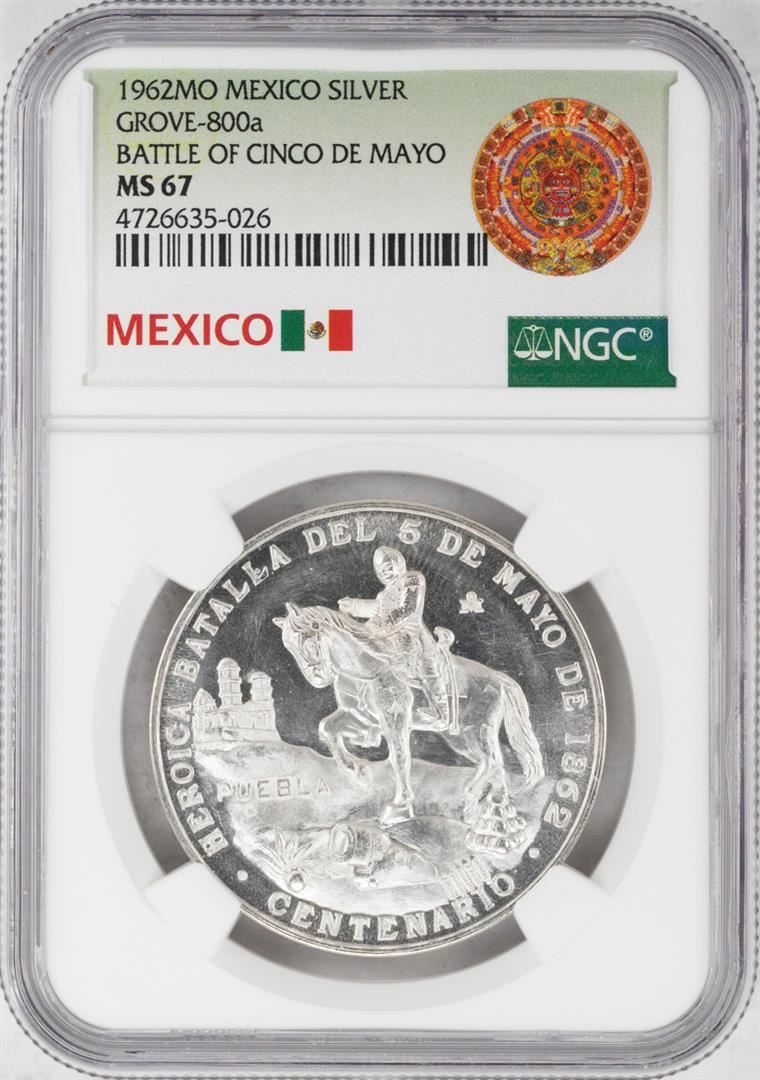 One 1962Mo Mexico Battle of the Cinco De Mayo Silver Coin NGC MS67. NGC Certified.
