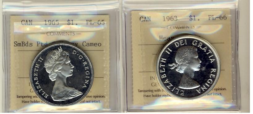 1963 $1 PL66 & 1965 SmBds Ptd 5 PL65. Lot of 2 ICCS Heavy Cameo graded coins