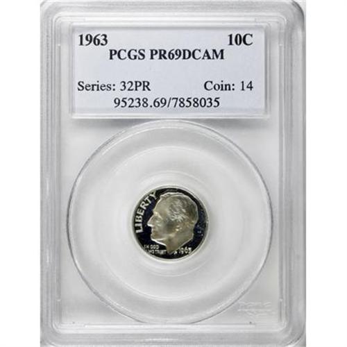 <B>1963 10C PR69 Deep Cameo PCGS.</B></I> . PCGS Population (186/0). NGC Census: (116/0). Numismedia Wsl. Price for NGC/PCGS coin in PR69: $160. (#95238)<BR><BR><b>Shipping:</b> Coins & Currency (<a target="_blank" href="http://www.heritageauctions.com/common/shipping.php">view shipping information</a>)