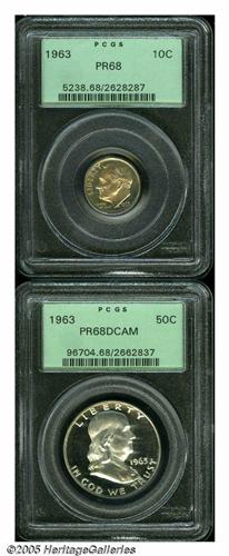 <B>1963<10C> Roosevelt Dime PR68 PCGS,</B></I> fully struck and pristine, with light toning on the obverse and speckled red-orange patina on the upper reverse; and a <B>1963 Franklin Half PR68 Deep Cameo PCGS,</B></I> the pristine, icy-white devices seem to float above watery, jet-black fields. Both pieces are in green label holders.<BR><I>From The Melrose Bay Collection.</B></I>