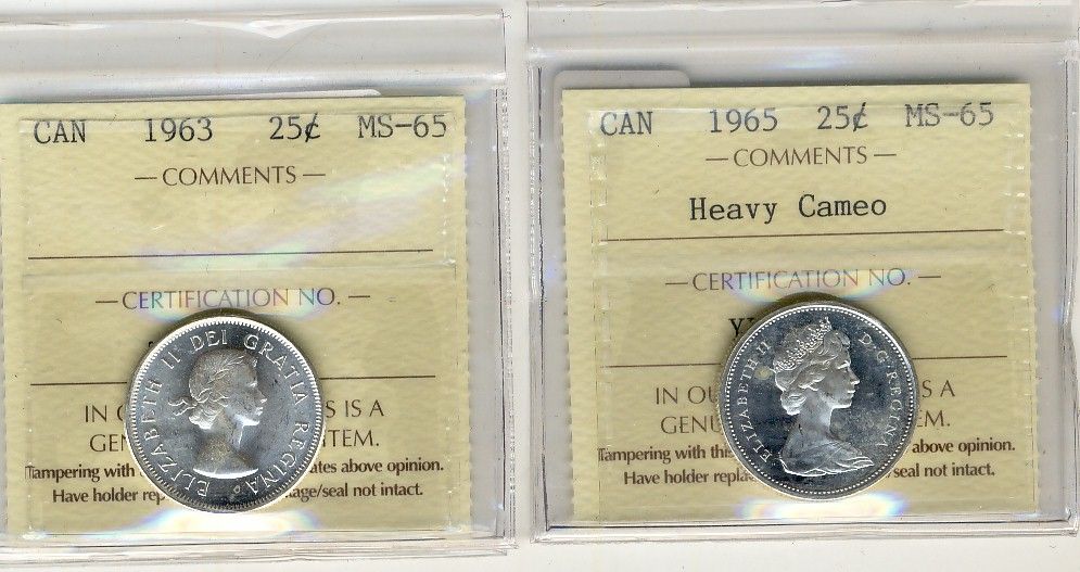 1963, 1965 25 Cents, ICCS MS65; Two coins, 1965 Heavy Cameo.