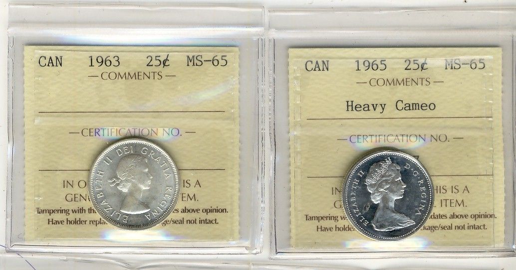 1963, 1965 25 Cents, ICCS MS65; Two coins, 1965 Heavy Cameo.