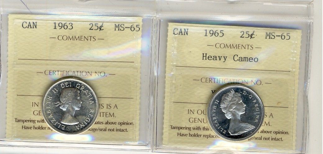 1963, 1965 25 Cents, ICCS MS65; Two coins, 1965 Heavy Cameo.