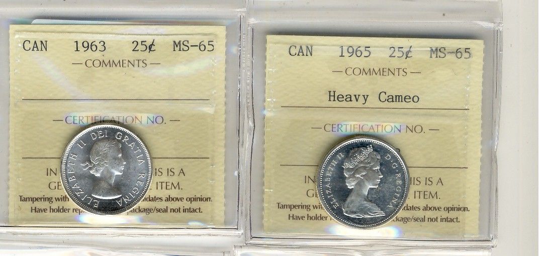 1963, 1965 25 Cents, ICCS MS65; Two coins, 1965 Heavy Cameo.