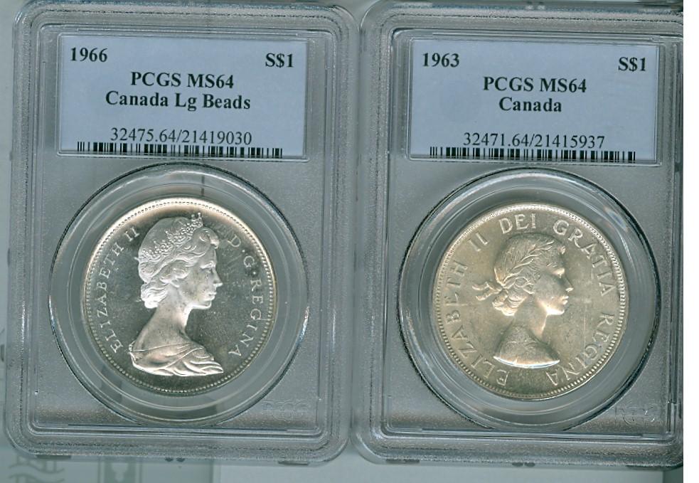 1963 & 1966 $1 PCGS MS64. Lot of 2 coins both white in colour.