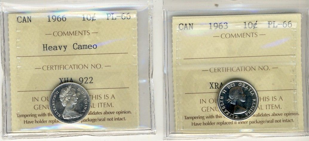 1963, 1966 10 Cents, ICCS PL66; Two coins, 1966 Heavy Cameo.
