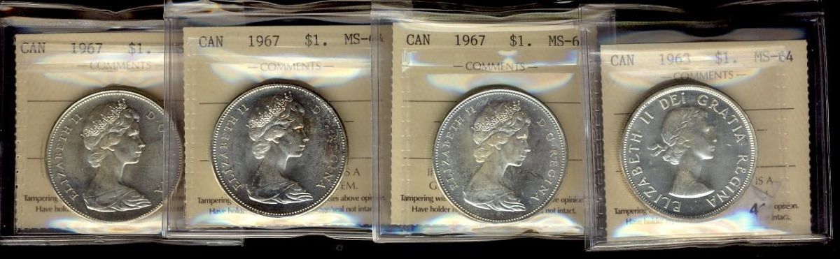 1963 & 1967(3) $1. Lot of four coins all ICCS MS64.
