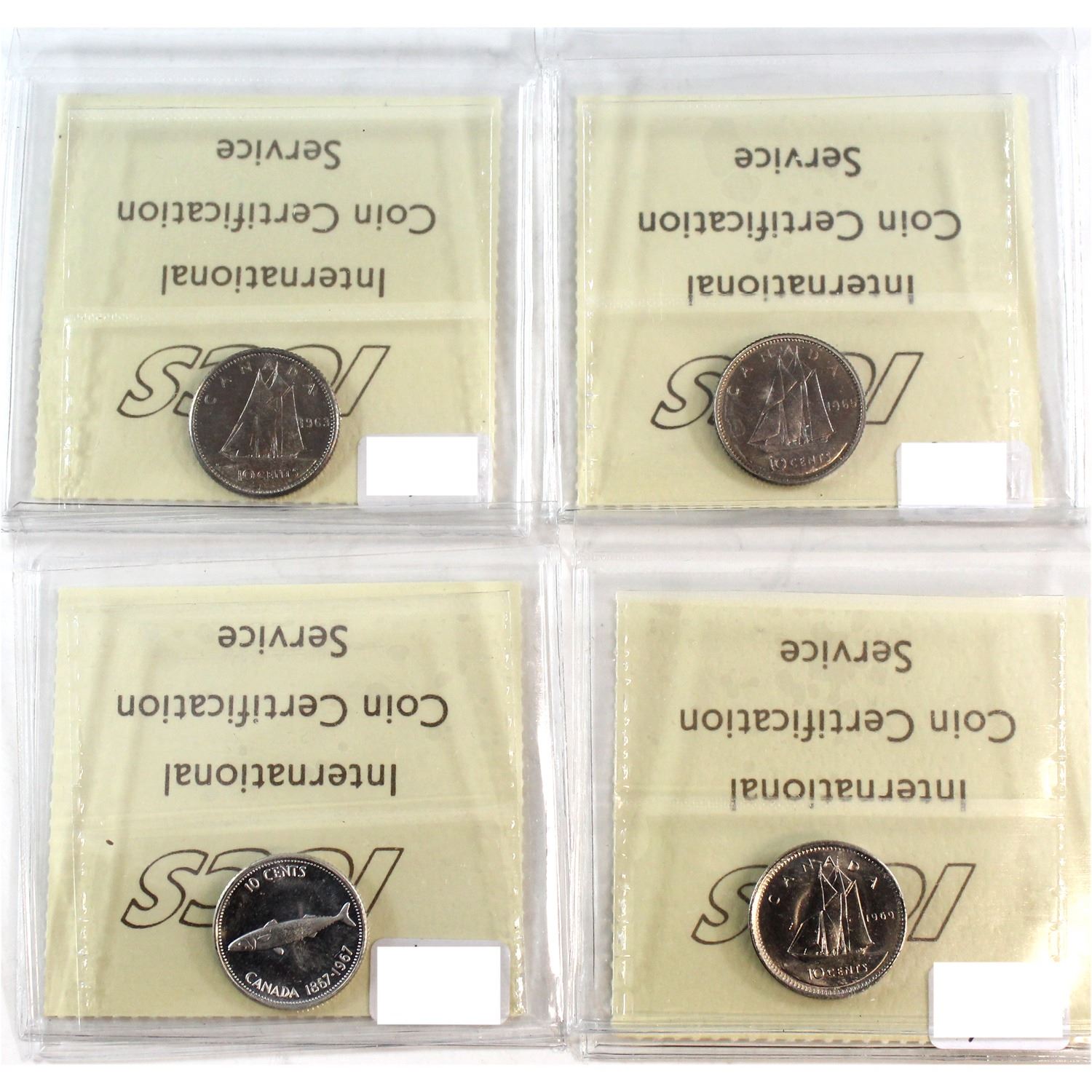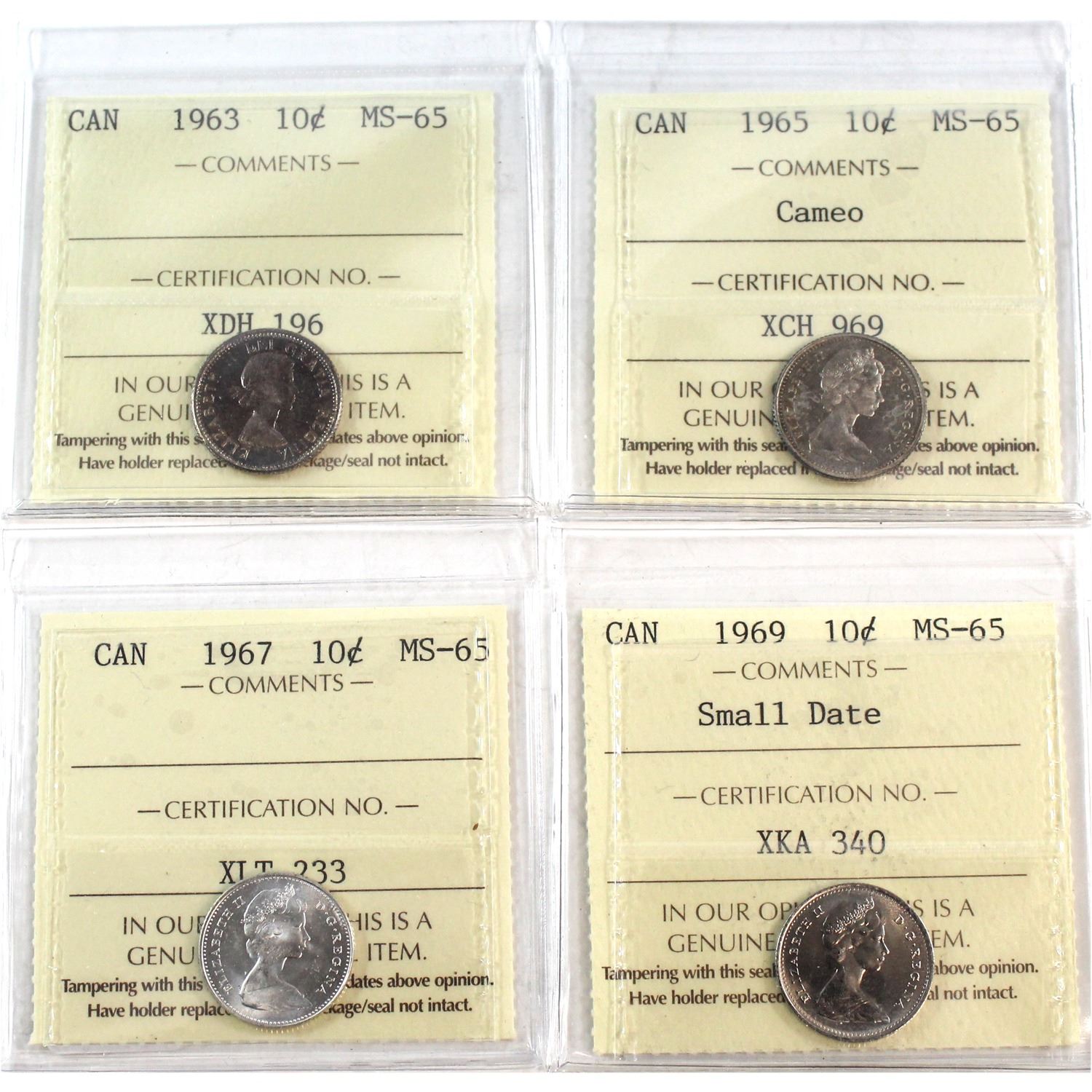 1963-1969 Canada 10-cent ICCS Certified MS-65 - 1963, 1965 Cameo, 1967 & 1969 Small Date. 4pcs