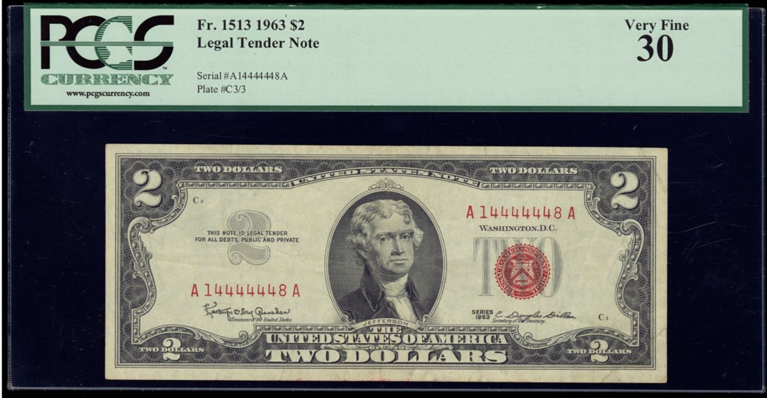 One 1963 $2 Fancy Serial Legal Tender PCGS 30.