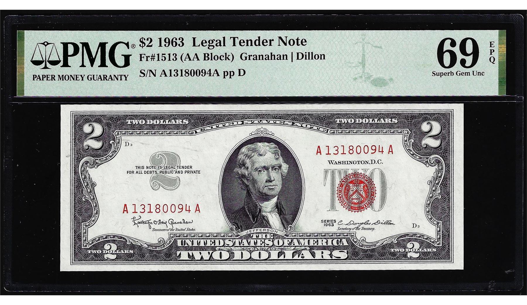 One 1963 $2 Legal Tender Note Fr.1513 PMG Superb Gem Uncirculated 69EPQ. PMG Certified.
